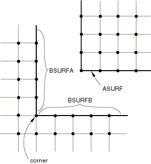 To accurately model the master surface with a corner shown in Figure 38.1.1–10, you must define two contact pairs: the first contact pair has ASURF as the slave surface and BSURFA as the master surface; the second contact pair has ASURF as the slave surface and BSURFB as the master surface.
