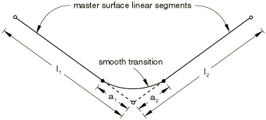 For finite-sliding, node-to-surface contact simulations with planar or axisymmetric deformable master surfaces, Abaqus/Standard will smooth any discontinuous transitions between two first-order element faces with parabolic curves. Discontinuous transitions between two second-order element faces are smoothed with cubic curves connecting two points located on the element's faces. This smoothing is shown in Figure 38.1.1–7 for first-order elements (linear segments) and in Figure 38.1.1–8 for second-order elements (parabolic segments). For finite-sliding, node-to-surface simulations with three-dimensional deformable master surfaces and rigid master surfaces using rigid elements, Abaqus/Standard will smooth any discontinuous surface normal transitions between the master surface facets.