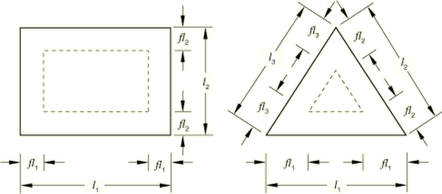 For three-dimensional, element-based master surfaces, f is defined as a fraction of the dimension of a facet as shown in Figure 38.1.1–9. The normal vector of a point within the region bounded by the dashed lines is computed to be normal to the facet. Outside this region the normal is smoothed with respect to the adjacent facets, using a generalization of the two-dimensional approach shown in Figure 38.1.1–7 and Figure 38.1.1–8. The physical geometry of a three-dimensional facet is not smoothed; only the surface normal definitions associated with the facet are affected by the smoothing operation. The implementation of the normal-direction smoothing algorithm is slightly different for surfaces based on rigid type elements (see “Rigid elements,” Section 30.3.1) than other element types. This difference typically has minimal effect on the convergence behavior or solution results; however, for example, different solution behavior may occasionally be observed between otherwise identical analyses in which a rigid body is modeled with R3D4 elements in one case and S4R elements assigned to a rigid body in another case.
