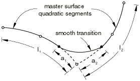 from the node at which the discontinuity exists; this smoothed segment will be used in the contact calculations. Thus, the contact surface will differ from the faceted element geometry. Smoothing affects only segments where the normal to the deformable master surface is discontinuous at the node joining two elements: it does not affect the two segments adjacent to the midside nodes on second-order element faces.
