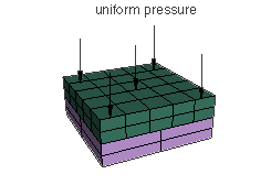 The bottom block is fixed to the ground, and a uniform pressure of 100 Pa is applied to the top face of the top block. Analytically, the top block should exert a uniform pressure of 100 Pa on the bottom block across the entire contact interface. Table 38.1.1–1 compares the Abaqus analysis results for different contact discretizations and slave surface designations.Table 38.1.1–1 Error (from analytical results) for various discretization/slave surface combinations.