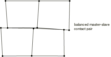 Using a sufficiently refined mesh on the slave surface will minimize such penetrations. Softened kinematic contact will allow penetrations since corrections are made to satisfy the pressure-overclosure relationship at the slave-nodes, not the condition of zero penetration.The kinematic contact algorithm for a balanced master-slave contact pair applies acceleration corrections that are linear combinations of pure master-slave corrections calculated in exactly the same manner as outlined above. One set of corrections is calculated considering one surface as the master surface, and the other corrections are calculated considering that same surface as the slave surface. Abaqus/Explicit then applies a weighted average of the two values. The exact weighting for each correction depends on the weighting factor specified for the contact pair (see “Contact surface weighting” in “Contact formulations for contact pairs in Abaqus/Explicit,” Section 38.2.2). The default for balanced master-slave contact is to weight each correction equally.