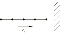 The kinematic contact algorithm strictly enforces contact constraints and conserves momentum. To achieve these qualities with a discretized model, some energy is absorbed upon impact. For example, consider a linear elastic beam modeled with several elements that impacts a rigid wall as shown in Figure 38.2.3–6. The kinetic energy of the leading node is absorbed by the contact algorithm upon impact. A stress wave passes through the truss, and the truss eventually rebounds from the wall. The kinetic energy after the rebound is smaller than before the impact because of the contact node's energy loss upon impact. As the mesh is refined, this energy loss is reduced because the mass and kinetic energy of the leading node of the truss become less significant.