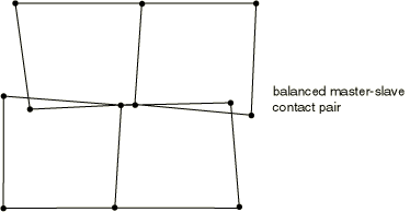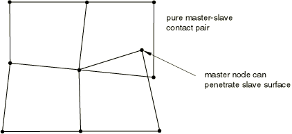 As with the pure master-slave kinematic contact algorithm, there is no resistance to master surface nodes penetrating slave surface faces with the pure master-slave penalty contact algorithm. Using a sufficiently refined mesh on the slave surface will help correct this problem.