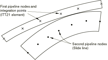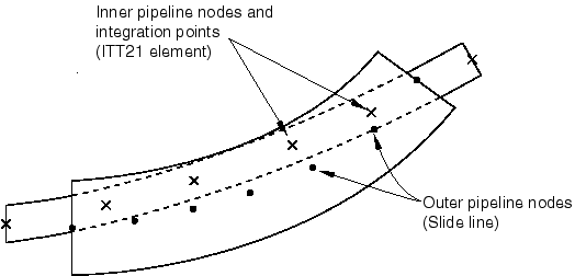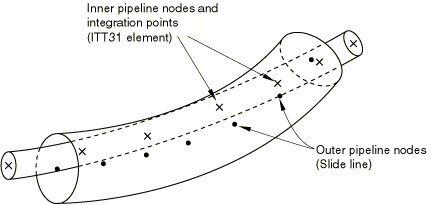 *SLIDE LINE Use the following option to give the radial clearance between the pipes as a positive number when modeling a tube sliding within another tube: *INTERFACE When the elements are modeling contact between the exterior surfaces of two pipes, the sum of the external radii of the pipes is given as a negative number. |