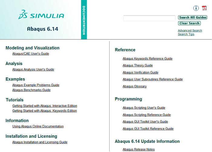 icon, which allows you to open the Abaqus PDF documentation collection; a link to the Advanced Search options; and a link to tips for searching the Abaqus HTML documentation collection.